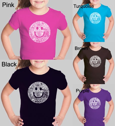 A smile can make a sad day happy, make a gloomy day shine. We took a smile face and created it out the word smile in different languages.Girl's TURQUOISE Smile Shirt L - Created using the word SMILE in different languages Specifications